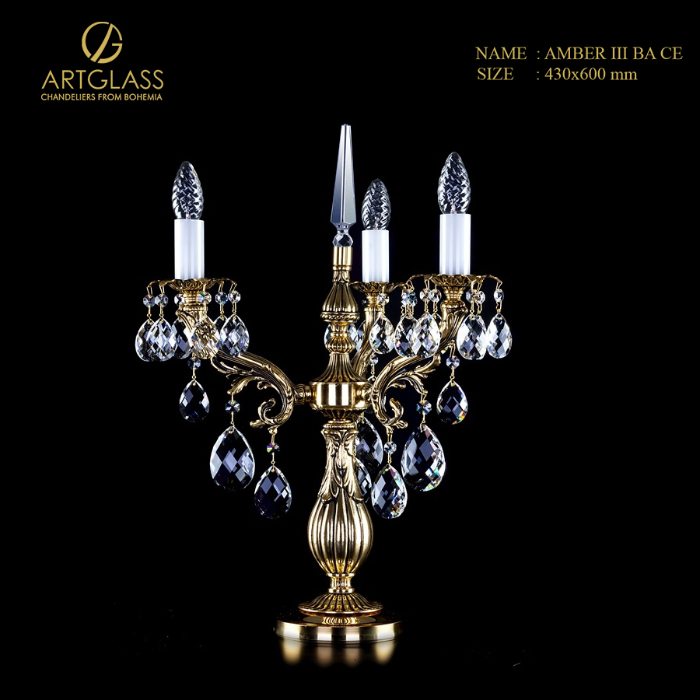 Đèn bàn AMBER III BRASS ANTIQUE CE mang phong cách cổ điển, sang trọng và quý phái. Đèn sở hữu bố cục đối xứng, nổi bật với các đường nét hoa văn trang trí bắt mắt, kết hợp cùng pha lê lấp lánh được cắt giác tinh xảo hình giọt nước. Đế đèn dạng trụ đứng, đảm bảo sự chắc chắn, các tay đèn uốn lượn mềm mại nâng đỡ những ngọn đèn giả nến mang đến cảm giác ấm cúng, hoài cổ.