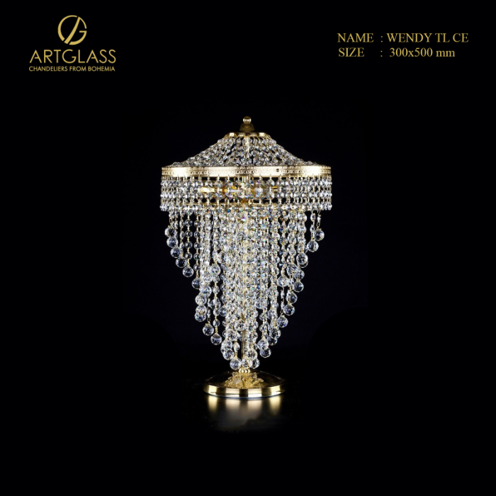 Đèn bàn pha lê WENDY TL CE là một kiệt tác nghệ thuật, mang phong cách cổ điển sang trọng và quý phái. Đèn nổi bật với hệ thống dải pha lê xếp tầng, tạo bố cục mềm mại như một thác nước sáng lung linh, tôn lên sự xa hoa và quý phái cho không gian.