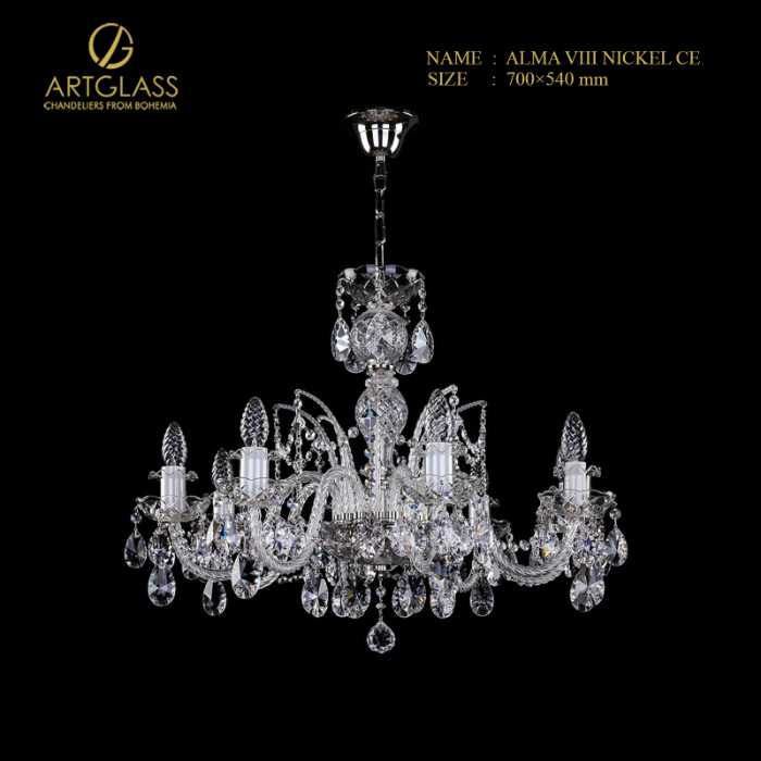 Cổ điển và trang nhã, đèn chùm pha lê cao cấp ALMA VIII NICKEL CE mang lại cho bất kỳ căn phòng nào vẻ đẹp sang trọng, quyến rũ và đặc biệt ấn tượng. Pha lê cao cấp tỏa sáng cho mọi không gian từ phòng khách, phòng ngủ, phòng ăn, nhà bếp, văn phòng hay nhà hàng khách sạn,…