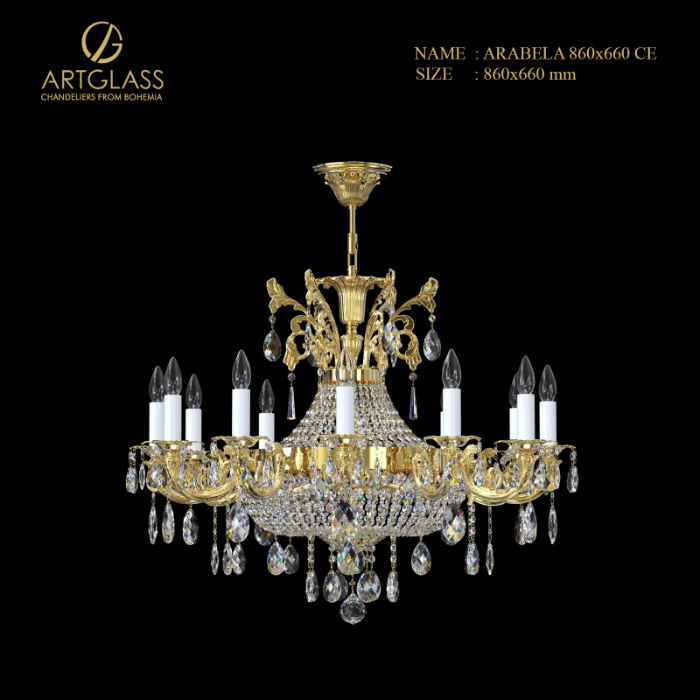 Đèn chùm pha lê ARABELA 860×660 POLISHED BRASS CE sử dụng 16 bóng đèn led công suất 40W, mang đến ánh sáng dịu nhẹ, ấm áp, không gây khó chịu cho mắt. Sản phẩm có khả năng tiết kiệm điện năng, mang đến hiệu quả kinh tế cao. Khi ánh sáng được tán sắc bởi những viên pha lê sẽ tạo nên một không gian lấp lánh khó diễn tả hết bằng lời.