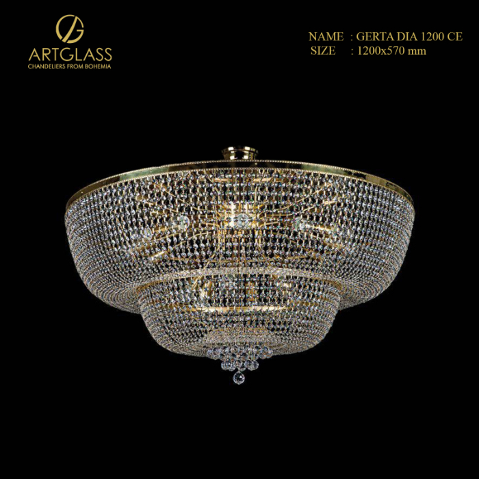 GERTA DIA 1200 CE được tạo nên với một bộ khung chắc chắn làm từ đồng thau mạ vàng, kết hợp với pha lê trang trí ở xung quanh. Đồng thau mạ vàng vừa đảm bảo tính thẩm mỹ cho sản phẩm, vừa giúp chống lại quá trình oxy hóa, giúp khung đèn luôn sáng bóng lấp lánh. Pha lê sử dụng để trang trí có nguồn gốc từ Bohemia, quê hương của những viên pha lê chất lượng bậc nhất thế giới. Sau khi được lựa chọn kỹ lượng, mỗi viên pha lê cần trải qua quá trình cắt giác tỉ mỉ để tạo được vẻ ngoài bắt mắt, nâng cao khả năng khúc xạ ánh sáng.