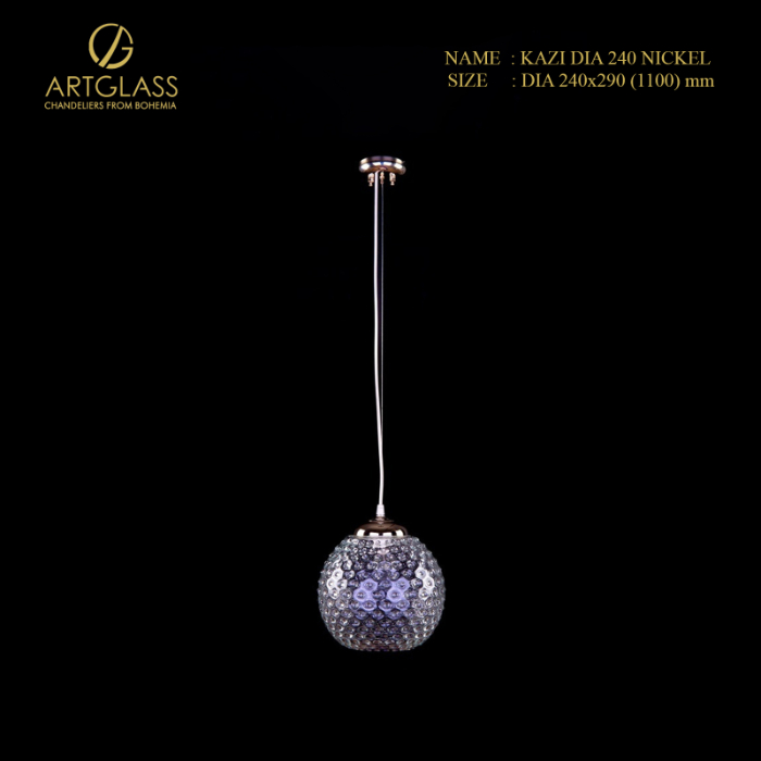 Đèn thả pha lê KAZI DIA 240 NICKEL sở hữu phong cách hiện đại, đơn giản, không có nhiều hoạt tiết trang trí nhưng vẫn thể hiện được sự đẳng cấp, sang trọng. Thiết kế của chiếc đèn nổi bật với chụp đèn hình cầu, được làm từ pha lê tinh khiết, kết hợp thêm họa tiết chấm chìm để tăng thêm vẻ đẹp nghệ thuật.