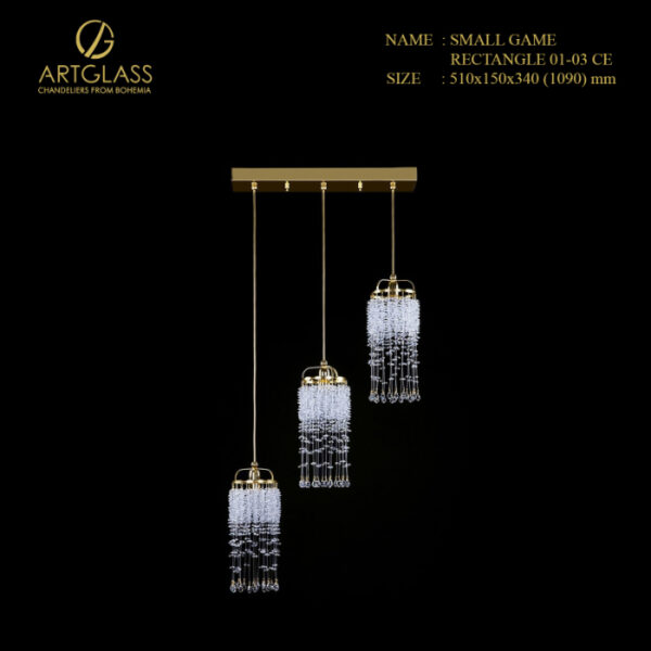 Phần khung của SMALL GAME RECTANGLE 01-03 CE được làm từ đồng thau chắc chắn, đã trải qua quá trình mạ vàng để tăng thêm vẻ đẹp thẩm mỹ, đồng thời cũng giúp chống lại quá trình oxy hóa. Từ khung đèn, những chùm đèn pha lê được treo tự do xuống phía dưới, các dải pha lê với mật độ dày đặc ở trên, thưa dần ở dưới. Nhìn từ xa, các chùm đèn trông tựa như những chiếc chuông gió, đang đung đưa một cách nhẹ nhàng, từ tốn.