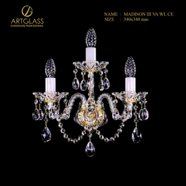 Đèn tường pha lê MADISON III VACHTLE CE mang phong cách châu Âu cổ điển, quý phái và sang trọng. Đèn sở hữu thiết kế với ba cây đèn nến nằm đối xứng, được nâng đỡ bởi tay đèn bọc pha lê tinh xảo. Từng chi tiết trang trí xung quanh được nghệ nhân chế tác sắp xếp một cách tỉ mỉ, tạo bố cục đồng đều, giúp chiếc đèn trông hoàn mỹ dù được nhìn ở bất cứ một góc độ nào.