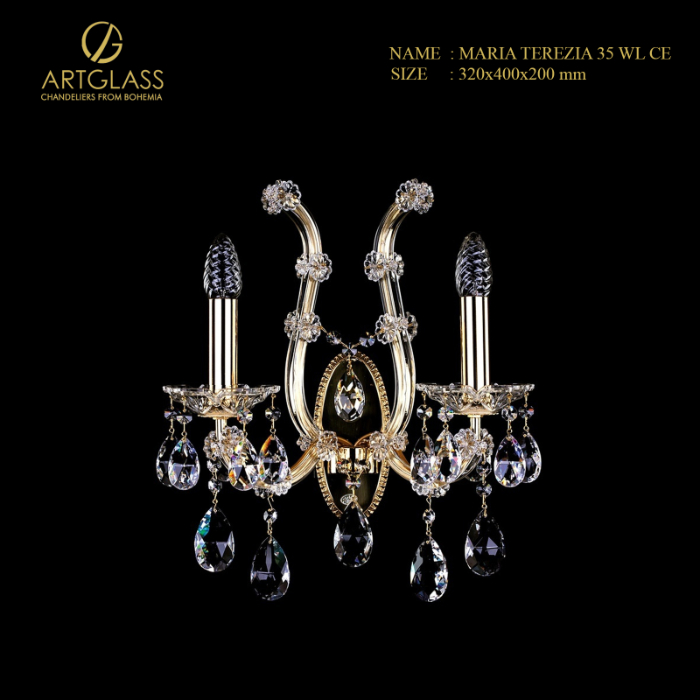 Đèn tường MARIA TEREZIA 18 WL CE mang phong cách châu Âu cổ điển, sang trọng và đẳng cấp. Đèn có thiết kế dạng đèn đôi đối xứng, với các tay đèn uốn cong nghệ thuật cùng các chi tiết trang trí tinh xảo. Điểm nhấn của sản phẩm tới từ hệ thống pha lê cắt giác hình giọt nước với độ tinh khiết và khả năng phản sắc cao, giúp ánh sáng đèn thêm lộng lẫy, huyền ảo.