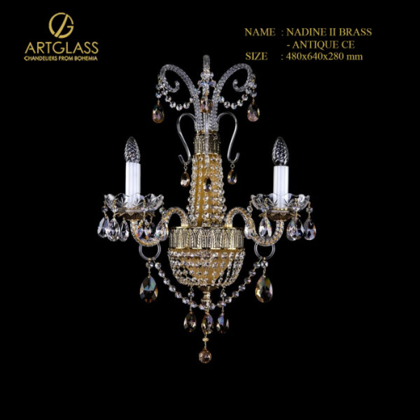 Đèn tường pha lê NADINE II BRASS ANTIQUE WL CE mang phong cách hoàng gia cổ điển, đẳng cấp và lộng lẫy. Đèn sở hữu thiết kế bố cục dạng đèn đôi cân xứng mang vẻ đẹp hài hòa, hoàn mỹ ở bất cứ một góc độ nào. Điểm nhấn của sản phẩm tới từ vô số những chi tiết trang trí bắt mắt bằng pha lê được sắp xếp khéo léo xung quanh khung đèn. Pha lê lấp lánh giúp cho ánh sáng đèn thêm lung linh, rực rỡ.
